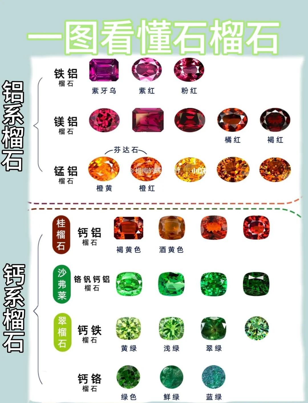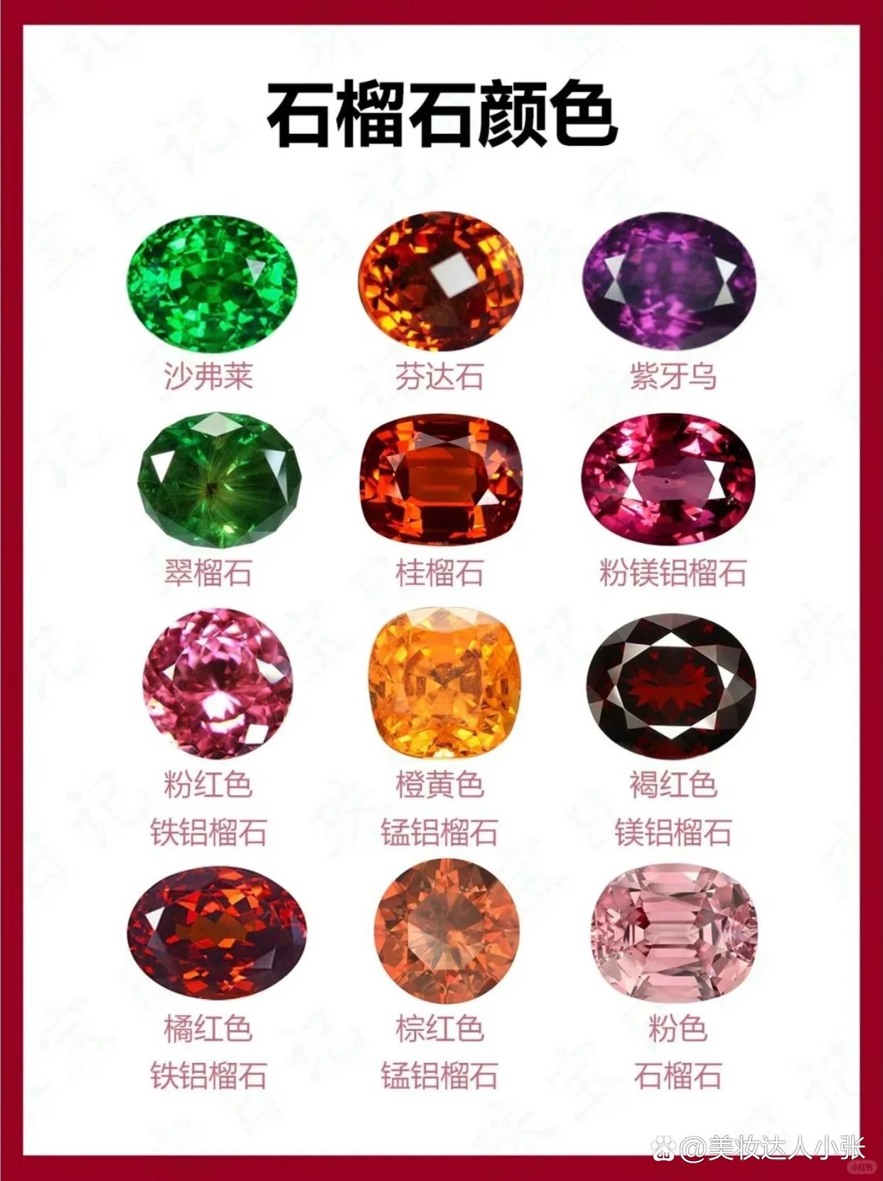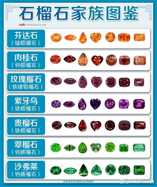 · 主要种类:石榴石因其化学成分的不同而分为多种,包括红榴石、铁铝榴石、锰铝榴石、钙铁榴石、钙铝榴石及其变种沙弗来石和肉桂石以及钙铬榴石等。