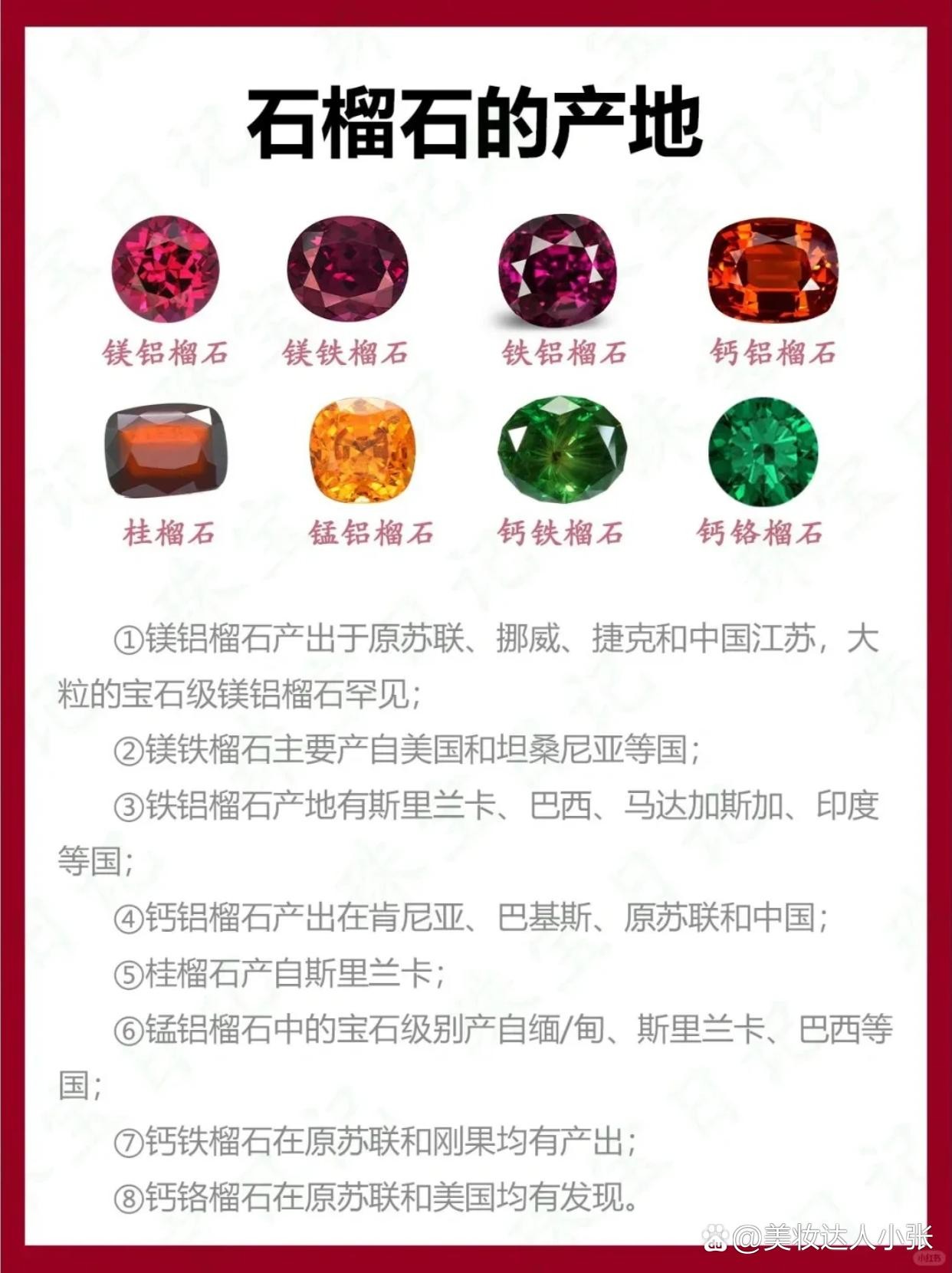 · 其他种类:钙铝榴石、钙铁榴石、钙铬榴石等也有各自的产地,如肯尼亚、巴基斯坦、原苏联、美国、刚果等地。