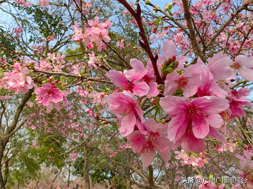 早上阳光明媚,走进樱花园这片广州樱的花海,一朵朵美丽、热情的广州樱向你露出“笑脸”。很多树都开了三四成花,一串串一簇簇挂满枝头。
