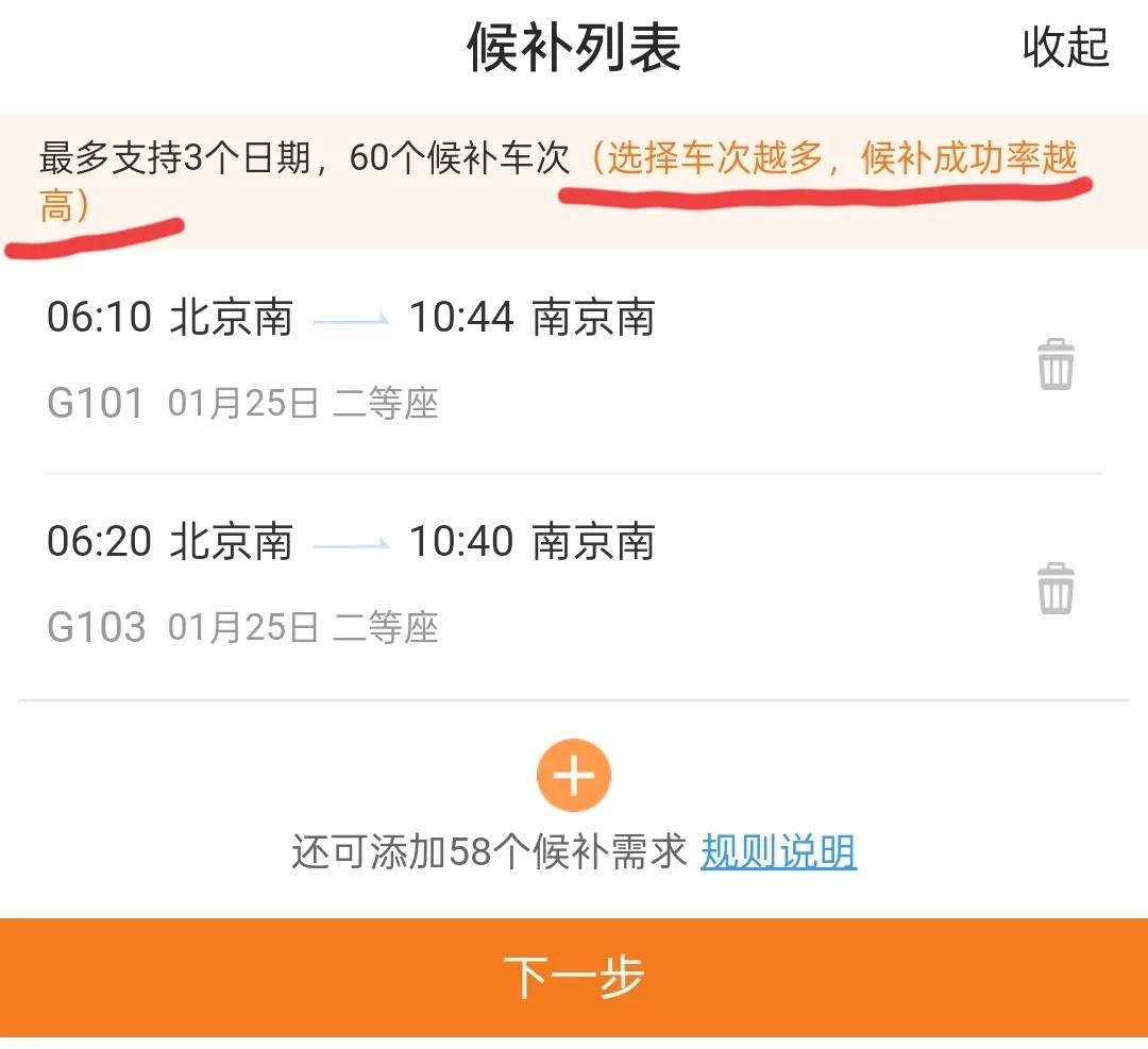 为提高候补成功率,可以多提交几个车次,目前12306支持60个候补车次,3个不同日期,全都搞起来,一定要顺利回家过年。