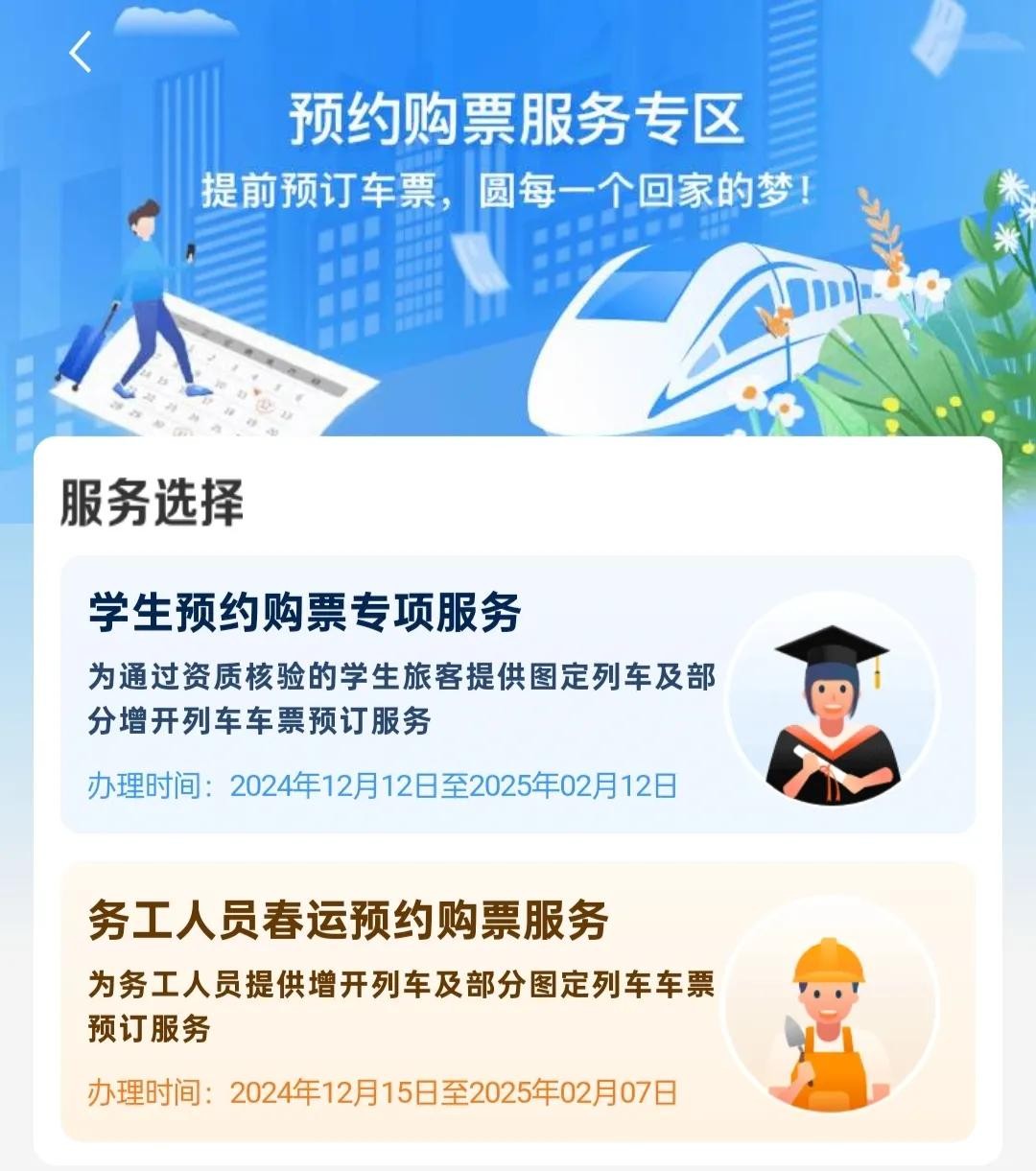 12306设置了“学生预约抢票专项服务”和“务工人员春运预约购票服务”,我已经不是学生了,所以,这里只说后面这一种。