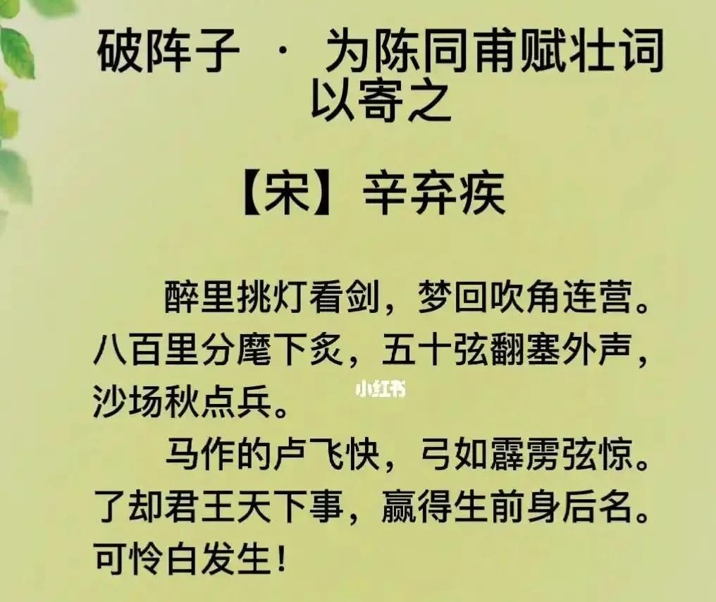 醉里挑灯看剑,梦回吹角连营。八百里分麾下炙,五十弦翻塞外声,沙场秋点兵。马作的卢飞快,弓如霹雳弦惊。了却君王天下事,赢得生前身后名。可怜白发生。
