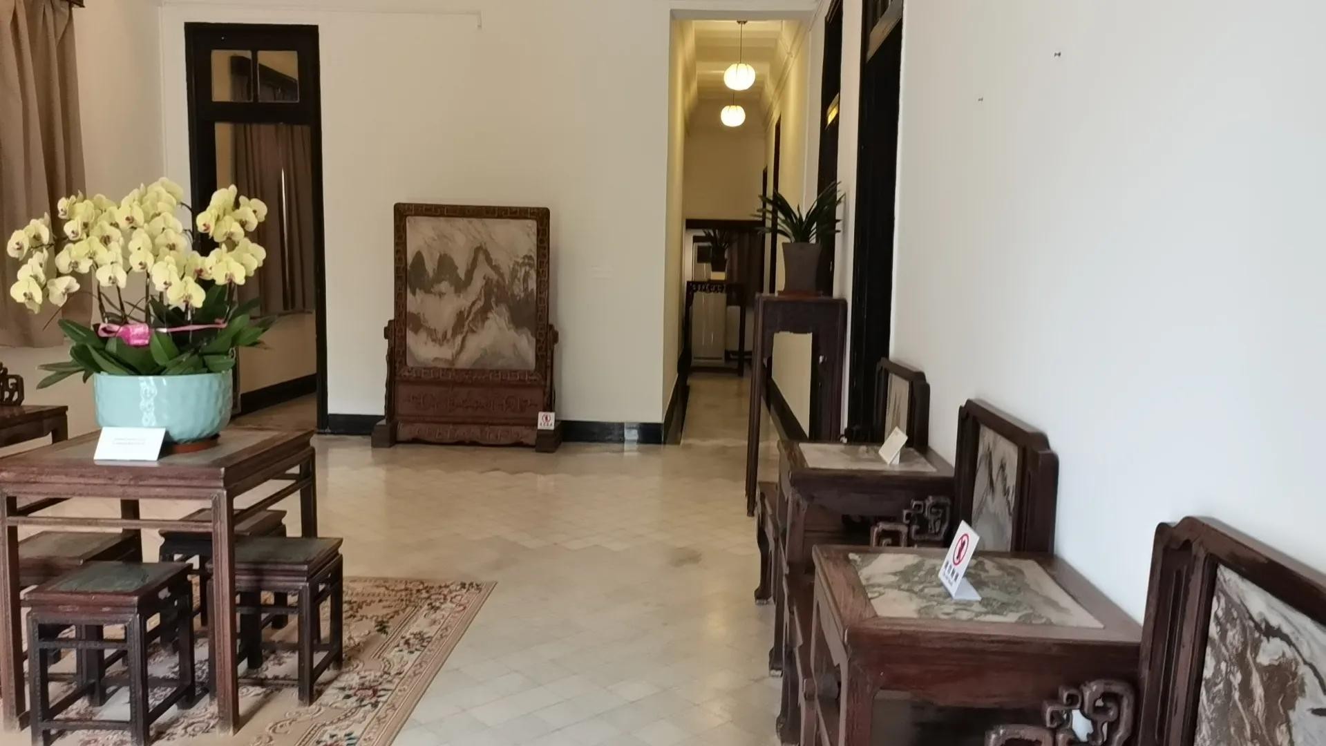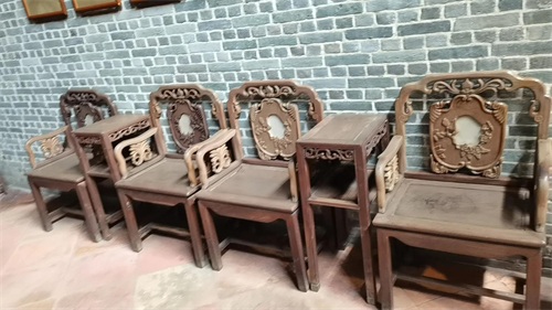 一楼正厅左右两侧靠墙分别放了4把椅子,椅子之间还有小桌子 。