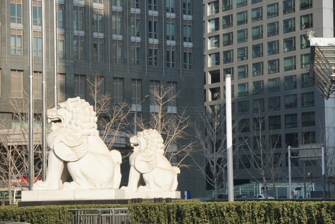 倒是中国建设银行总部前段一对硕大的貔貅应是最靓丽的景观。在夕阳的照耀下,栩栩如生,威风八面。