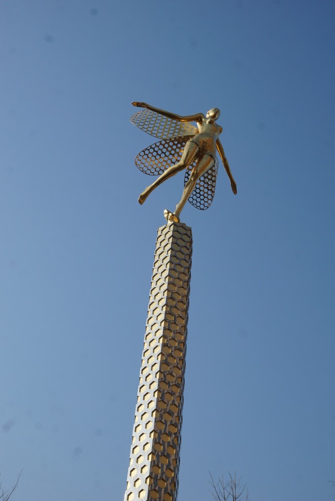 这是金融街最瘦高的一个雕塑。名字叫“金蜜蜂”,是魏小明的作品,用铸铜和不锈钢材料,高12.8米。