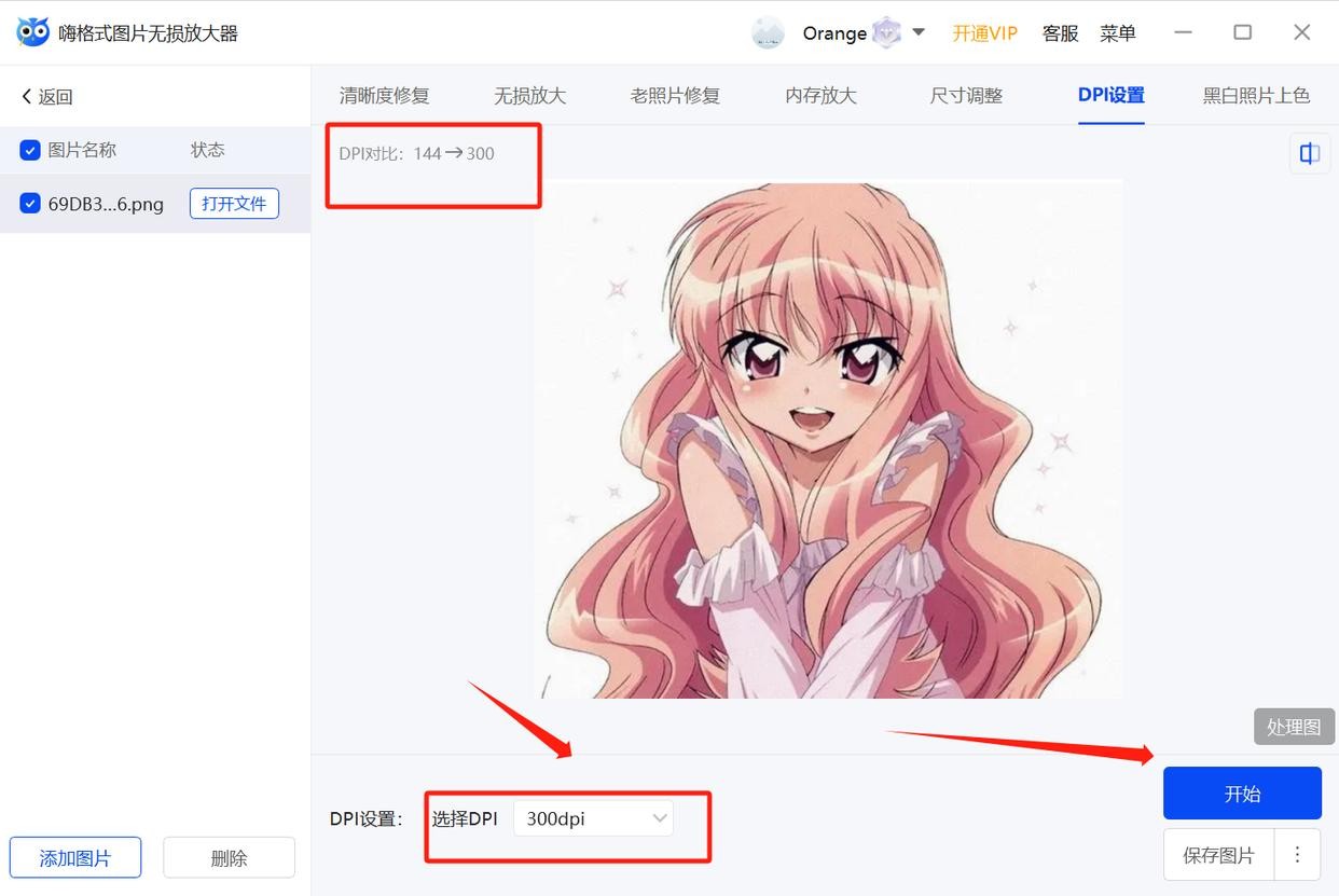 2、上传图片后,直接选择需要调整的分辨率参数,然后点击【开始】设置就可以快速修改图片分辨率了!
