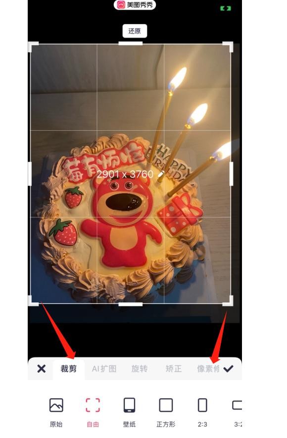 3、在图片编辑页面上,选择裁剪,并点击“自由”,即可拖动编辑框调整图片分辨率。也可以直接在页面输入自己需要的像素尺寸。