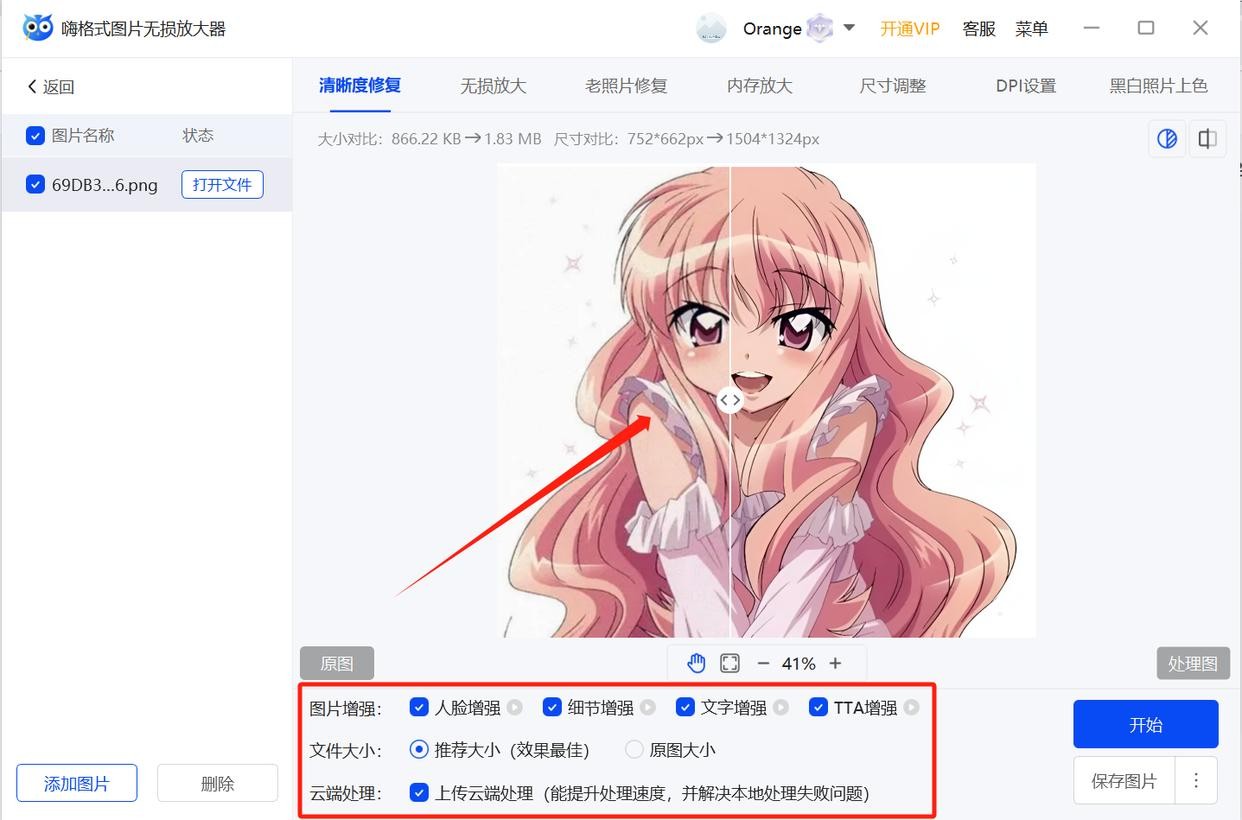 3、根据需求进行相应的参数设置, 图片上传成功后,在左边栏的功能窗口里设置相应的图片增强参数。 最后点击“开始”,即可进行“清晰度修复”的操作。