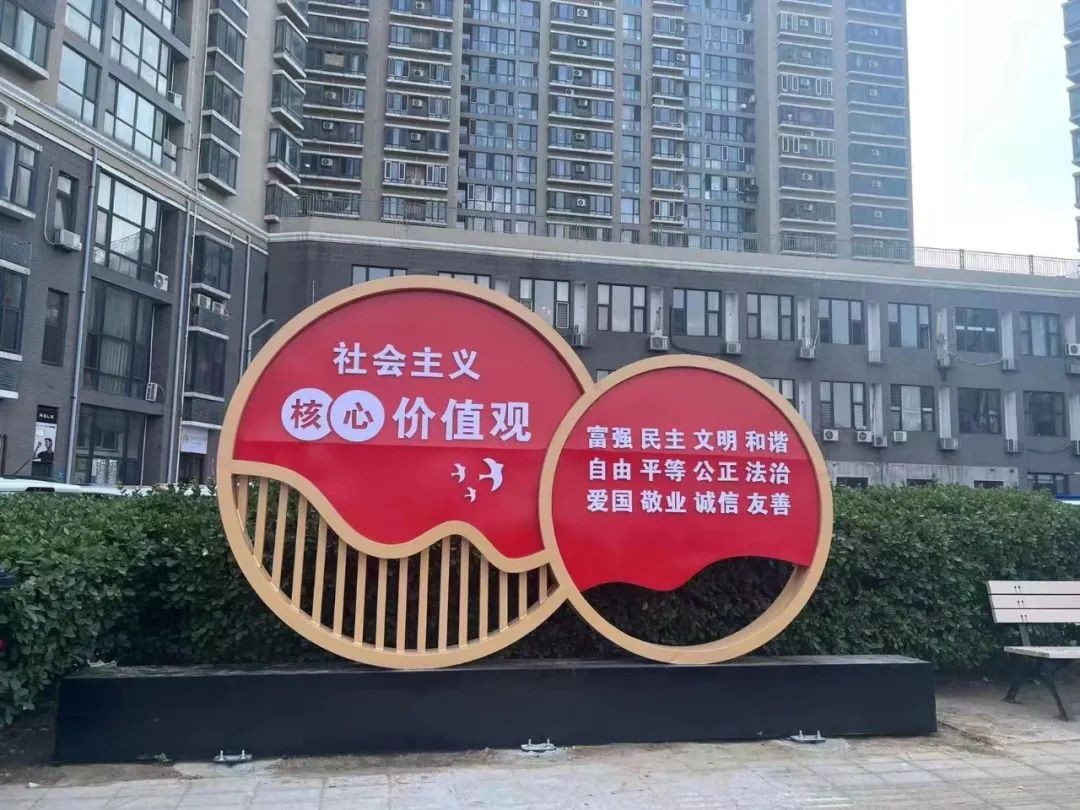 社会主义核心价值观是引导人们的行为和价值观念,推动社会的发展和进步的价值观念,通过大气醒目的景观小品传递出来,烙印在每一位居民的心中。