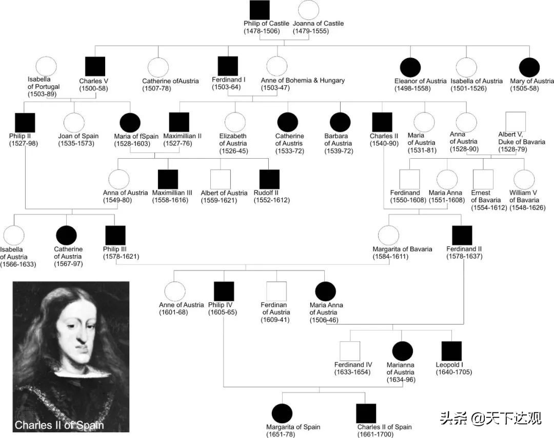 在卡洛斯二世之前的200年中,11次婚姻中有9次是近亲关系,包括两对舅舅和外甥女的婚姻,两对第一代堂兄弟姐妹之间的婚姻。