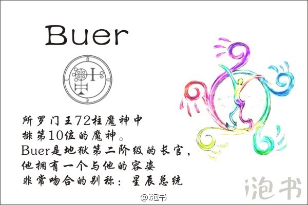 是一个外形好像星星/海星、或是好像车轮的样子长着五支脚的恶魔。当太阳到达射手座的位置时,他会以有着像星星般闪亮光辉的皮肤的半人马的形象出现。在《Grand=Grimorium》魔导书中写到,Buer是地狱第二阶级的长官,他拥有一个与他的容姿非常吻合的别称:星辰总统。