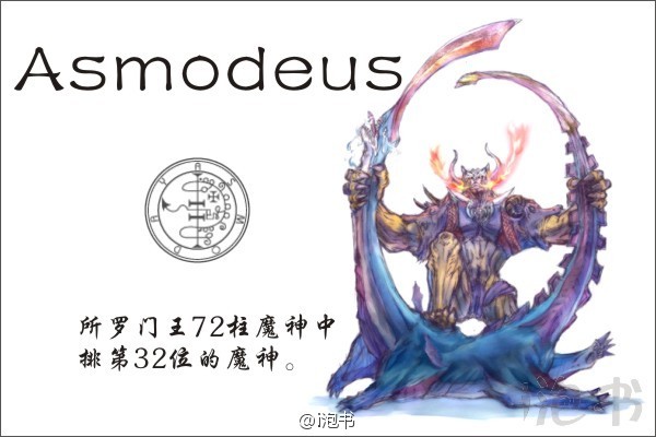 七大罪中他是司“淫欲”的代表恶魔。也是所罗门王七十二柱魔神之一,又作Asmodeus、Aesma、Aschmedai、Asmoday、 Asmodee、Asmadai、Asmodius、Asmodaios、Hasmoday、Chashmodai、Azmonden。这个魔神可能是由祅教从波斯传过来的,原本是祅教暗黑魔神阿里曼(Ahriman)的六大手下之一:Aeshma-Deva,字意本身就有“狂暴”的意思。乃情欲之魔神。演化进犹太教时就称呼他为“恶灵之首”、“魔神”,原在基督教中并不是很重要的恶魔,是在外典《托比特书》中登场的。他独占中意的人类女子,杀掉所有与那女子成亲的男子。最后被大天使拉斐尔施计逼出原形,逃往埃及后被大天使加百列擒住。直到中世纪的魔术书中才被大量使用作恶魔的代名词,如“被制裁的造物”、“地狱之王”、“复仇公子”、“淫欲公子”等。