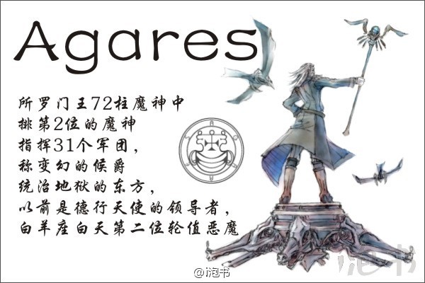 所罗门王72柱魔神中排第2位的魔神,名为Agreas或者Agares。Agreas的希伯来名字假定是从拉丁文的Agar而来。他听命于Virtues。指挥31个军团,称变幻的候爵,统治地狱的东方,以前是德行天使的领导者,白羊座白天第二位轮值恶魔。