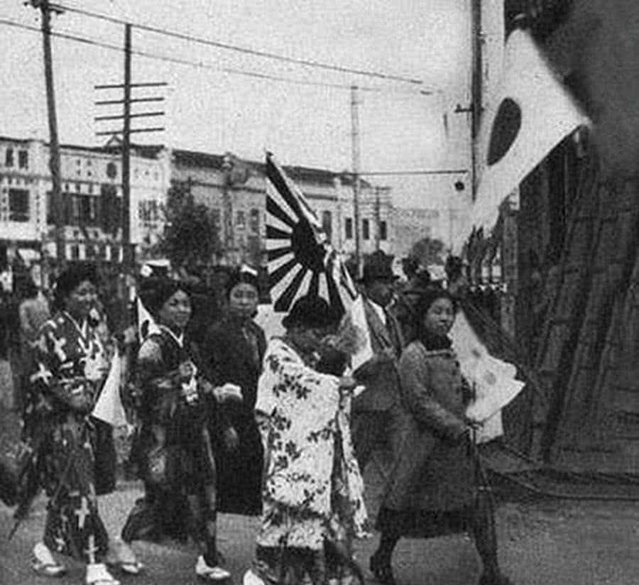 图2:在日寇侵占南京前,隐藏在南京城中的日本间谍和侨民,就在大肆进行破坏活动,给城外发动进攻的日寇提供了很多情报。日寇正式进入城中后,这部分人立即从暗处跳了出来,公开配合日寇活动。图上就是南京刚刚沦陷后,一群迫不及待走上街头庆祝的日本女人。