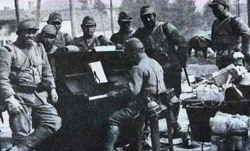 图3:日寇侵占南京后,一群鬼子在街头得意地弹起了钢琴。