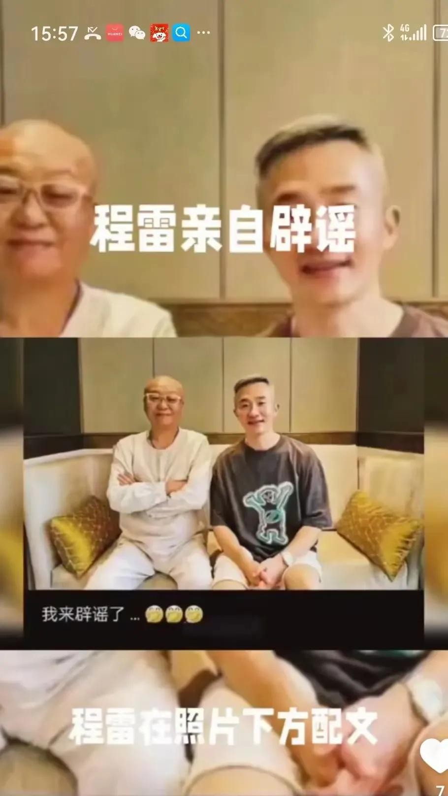 就在众人疑虑的时候,程雷亲自现身辟谣。他在朋友圈晒出了一张与友人合影的照片,笑容满面,状态良好。还配文幽默而无奈:“我来辟谣了。”照片中的程雷头发稀疏,两鬓有些花白,但脸色红润,气色很好,身体状态明显很健康。