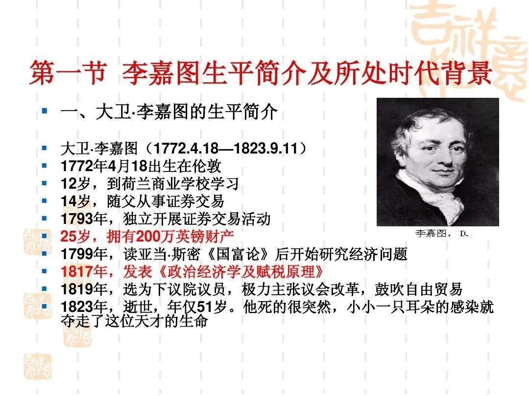 大卫·李嘉图(1772—1823),英国经济学家,资产阶级古典政治经济学的完成者。他曾从事交易所活动,参加当时经济问题的争论,代表产业资产阶级的利益,反对英格兰银行发行不兑现的银行券,要求稳定通货;反对《谷物法》,与代表地主阶级利益的马尔萨斯相对立。在经济理论上,他提出了在资产阶级眼界内所能达到的最彻底的劳动价值论。他以此为基础,说明了资本主义生产关系的内在联系,指出了资本主义社会阶级利益的冲突。他的学说对经济科学的发展有很大影响。主要著作有《政治经济学及赋税原理》。