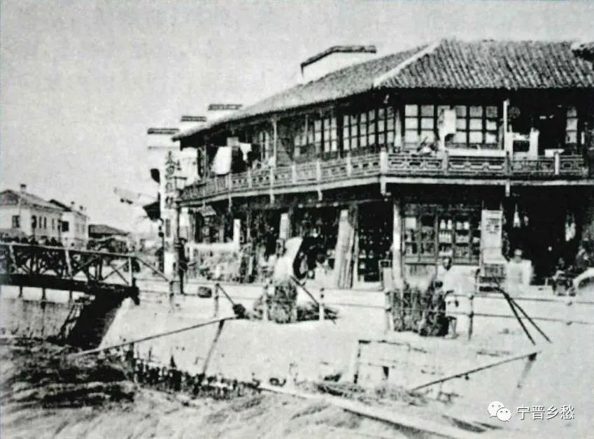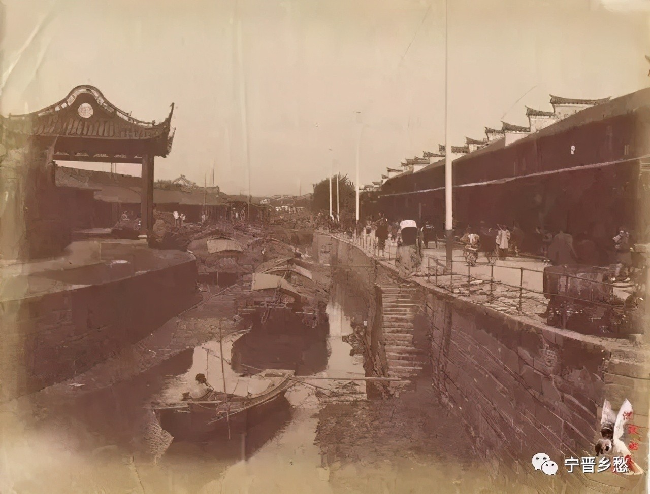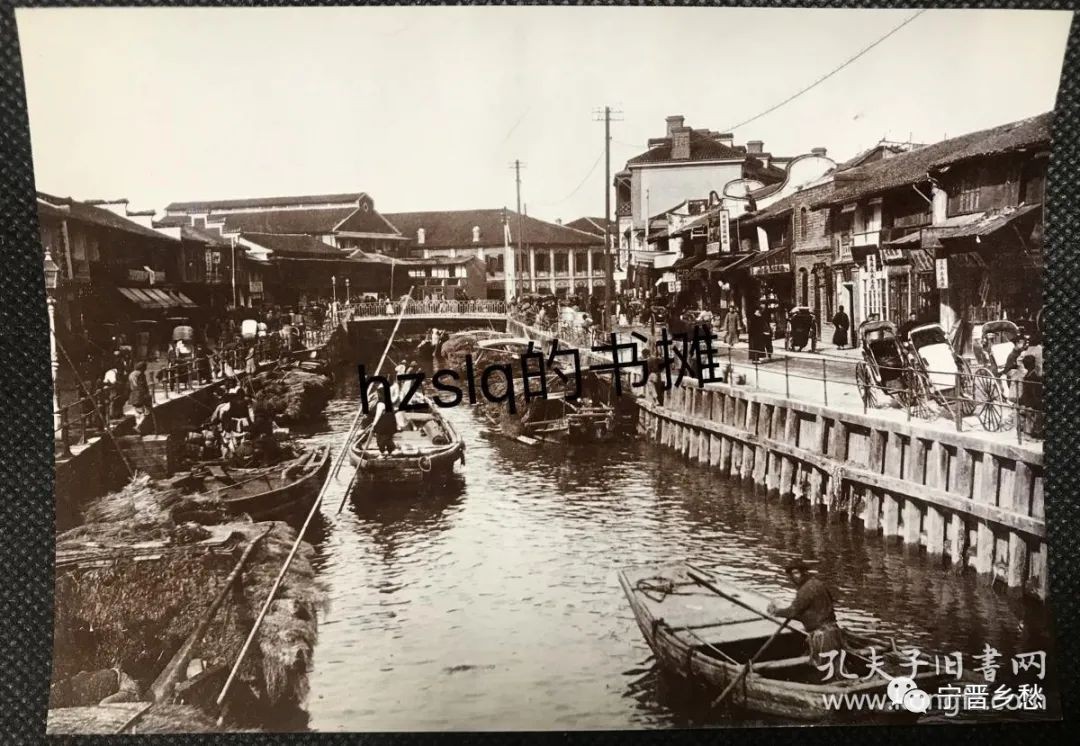 清末上海洋泾浜河道及周边商铺建筑等景象,可见行驶的木船和远处小桥、行人。