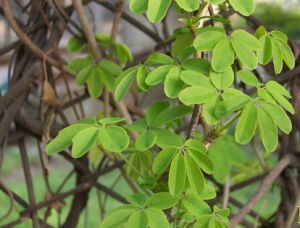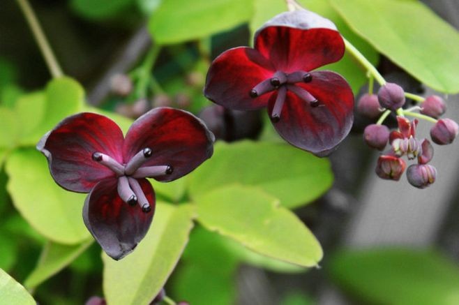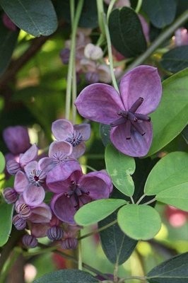 五叶木通幼枝灰绿色,有纵纹。掌状复叶,簇生于短枝顶端;叶柄细长。夏季开紫色花,短总状花序腋生。