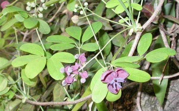 五叶木通生长在低海拔山坡林下草丛中,夏季开紫色花