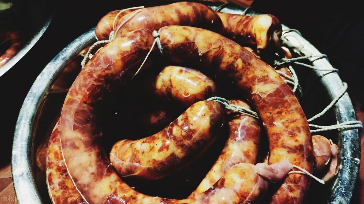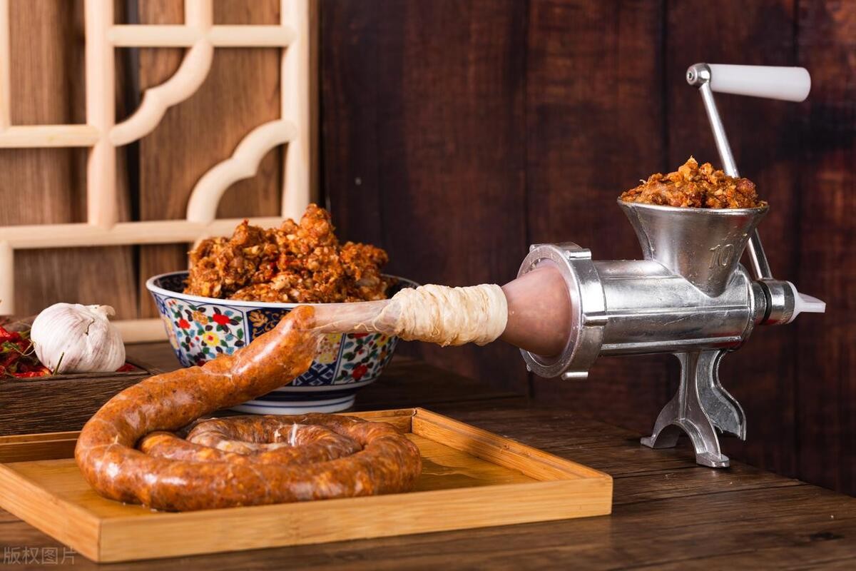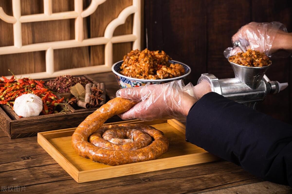 灌香肠是一项传统美食制作技艺,尤其在冬季,很多家庭都会自制香肠以备节日或日常享用。