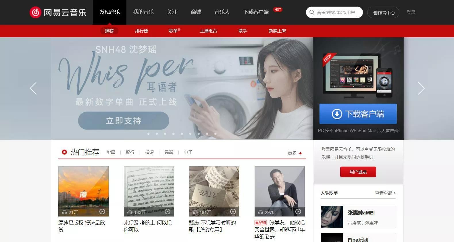 在网站里你可以按照它给出的推荐歌单选择你要听的歌曲,也可以按照歌单、音乐电台、排行榜、歌手等分类查找喜欢的歌曲。