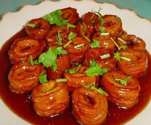 10. 九转大肠:九转大肠原名为红烧大肠,在清朝光绪初年由济南九华楼酒楼店主首创,是山东省济南市的一道传统名菜。九转大肠吃法独特,口感脆却不乏嚼劲,卷成球形可以一口吃下,在当地很受欢迎,味道真的杠杠的,你品尝过吗?