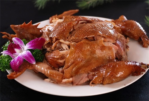 7. 德州扒鸡:德州扒鸡又称德州五香脱骨扒鸡,是著名的德州三宝(扒鸡、西瓜、金丝枣)之一。德州扒鸡是中国山东传统名吃,鲁菜经典。德州扒鸡制作技艺为国家非物质文化遗产。形色兼优、五香脱骨、肉嫩味纯、清淡高雅、味透骨髓。