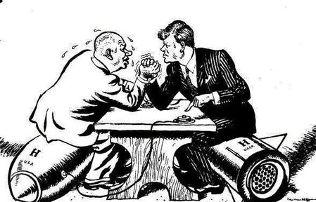 冷战相对于热战,由于双方刚刚经历过残酷的战争而且还是曾经的盟友,或忌惮于对方的军事政治实力,或是国内的国情,双方都不愿爆发热战,而且随着两大阵营都拥有了核武器,相互毁灭都是很愚蠢的事情。于是双方在各个领域展开了竞争,首先1949年以美国为首成立了北约,1955年以苏联为首成立华约,标志两大军事政治集团的对峙局面正式形成。之后双方在核武器,导弹,航天等领域展开激烈的竞争,双方互有攻守,期间发生了古巴导弹危机,中美建交等重要事件,中国一开始是一边倒站在苏联这边,后来又和美国接触来敲打苏联。