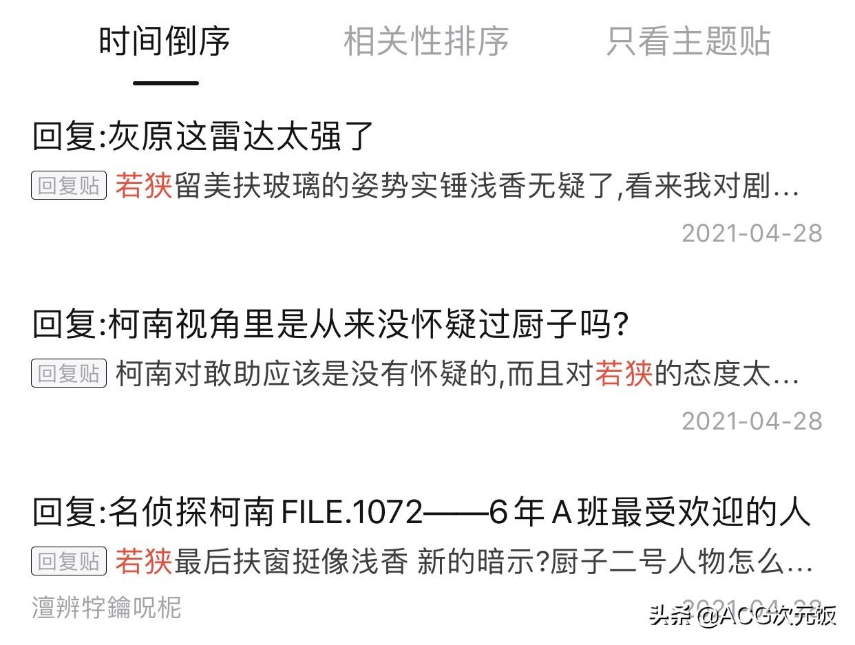 这一话无疑是主线剧情,出场的都是重量级人物,比如小哀、柯南、朗姆、若狭留美等。在发生了一系列事件后(防止剧透),若狭留美有了两格单独的画面,一格是她在电梯上伸出手掌,一格是她看见了骑着餐车的朗姆若有所思。就这么小小的两格画面,却掀起了轩然大波,各大论坛都能看见柯迷们在热火朝天的讨论。