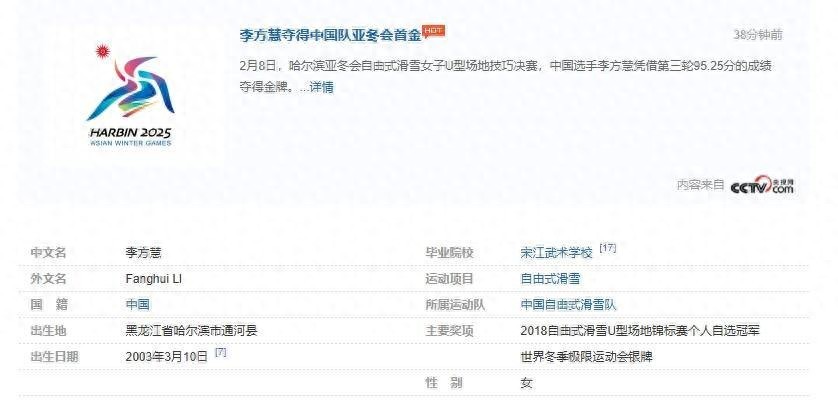 在2025年第九届亚冬会自由式滑雪女子U型场地技巧决赛赛场上,李方慧凭借行云流水般的滑行、高难度的动作,征服了现场观众与裁判,为中国体育代表团摘得本届亚冬会首枚金牌。而在她耀眼成绩的背后,是与菏泽郓城宋江武术学校的不解之缘。