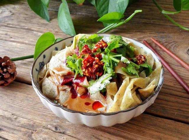 3.将香干片成小菱形,放热油中炸至外皮发脆,再放入酱油水中煮开略煨。碗内盛上嘎巴,浇上卤汁拌匀,再加腐乳汁、辣椒油、香干片、芝麻酱、香菜末即成。