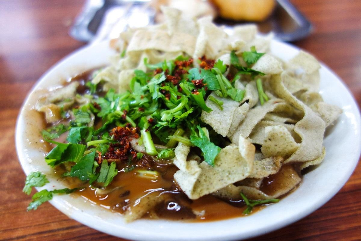 锅巴菜,其实也就是煎饼果子的皮,切成面条状,似“菜”非“菜”,吃上一口咸淡适中,再舀几勺辣子,撒入香菜碎,味道更绝,难怪那么多天津人对它爱不释口。