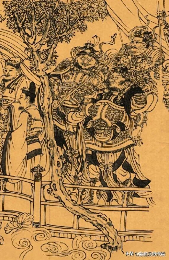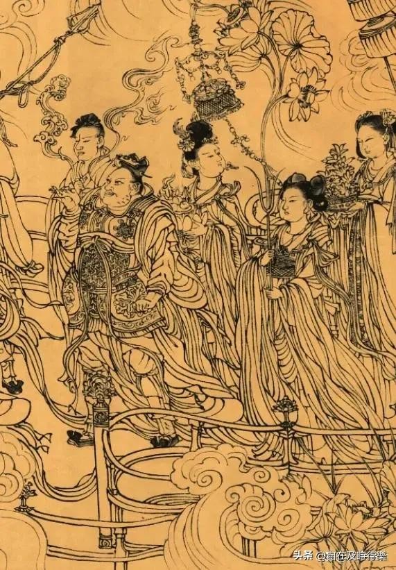 图中以道教故事为题材,描绘了以东华帝君、南极帝君、扶桑大帝为主的八十七位列队行进的神仙,画面纯以线条表现出八十七位神仙出行的宏大场景,形神刻画细致入微。画面笔墨遒劲洒脱,根根线条都表现了无限的生命力,如行云流水,充满韵律感,代表了中国唐代白描绘画的最高水平。