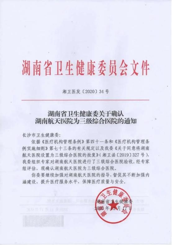 湖南航天医院在2019年7月正式启动三级综合医院创建工作,经过全院干部职工一年多的共同努力,于2020年11月10日通过湖南省卫生健康委员会组织的专家评审团进行的现场评审,12月17日,省卫健委发文正式确认湖南航天医院成为三级综合医院。
