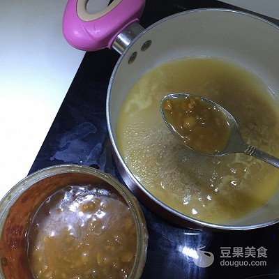 2、锅里煮开水后勺入黄豆酱煮开