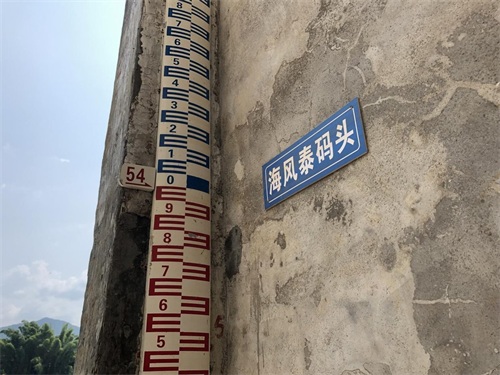 海风泰码头,码头建筑的墙上有一个标尺,这个标尺记录了松口古镇历史上最高的水位54米。