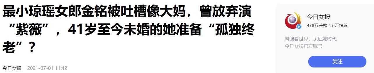 信源3:今日女报2021-07-01 11:42 最小琼瑶女郎金铭被吐槽像大妈,曾放弃演“紫薇”,41岁至今未婚的她准备“孤独终老”?