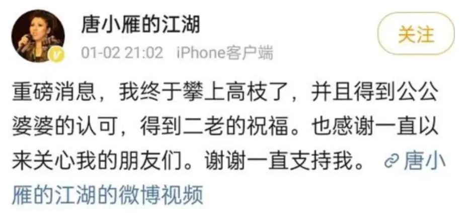 有人说唐小雁动机不纯,说徐童被她蒙骗,没想到她不仅不否认还亲自盖章发文:“我终于攀上高枝了。”