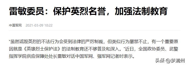 中国军网2021-03-09——雷敏委员:保护英烈名誉,加强法制教育