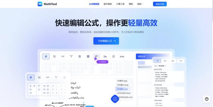 快速编辑数学公式的在线网站,不用下载就能使用!支持导入Latex、mathml文件,导出成Latex、mathml、jpg、png、svg格式,还可以轻松创建并处理公式符号,超赞哒~