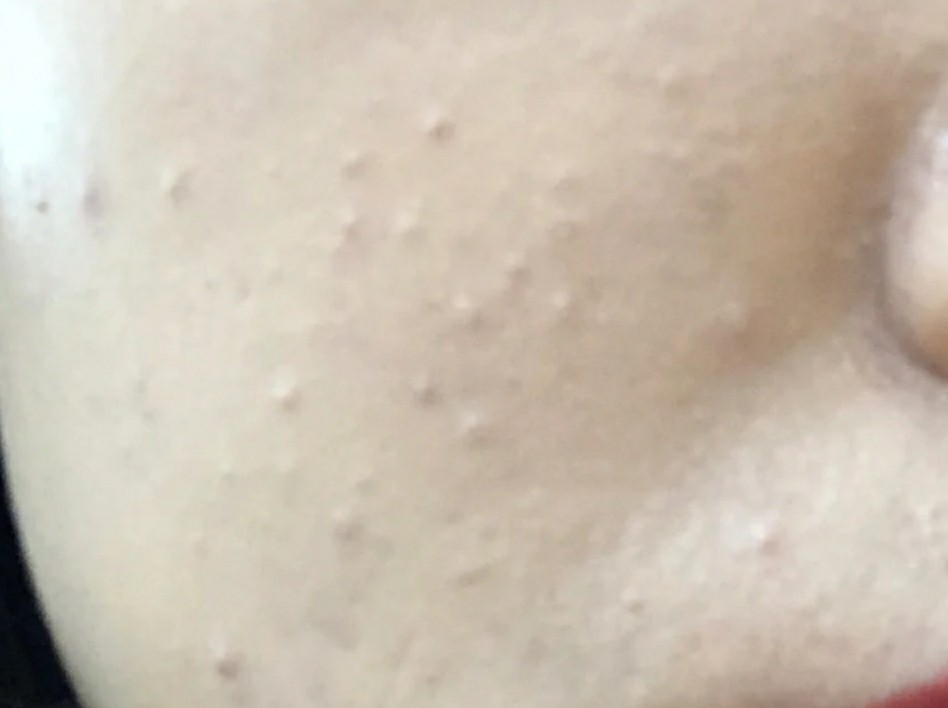 这种就是闭口,闭口其实是痘痘的前身,长在脸上不痛不痒的,但是用力挤能挤出白色的颗粒状的脏东西,在额头和下巴的位置比较常见。