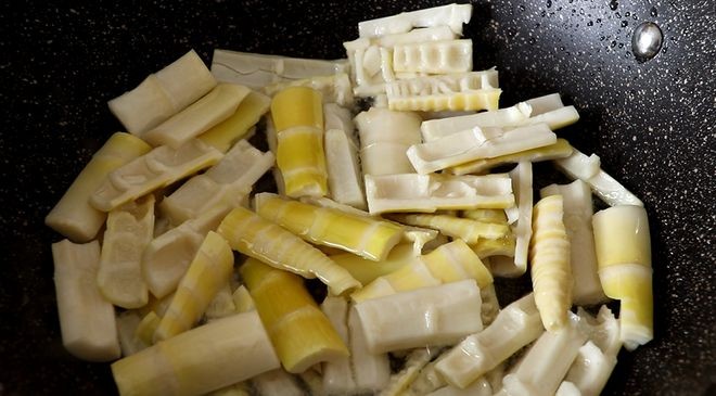 4、 另起锅,锅中倒油,油热后倒入春笋,炒至表面微黄之后加入少许盐、白糖、生抽调味,接着加入适量清水焖煮。