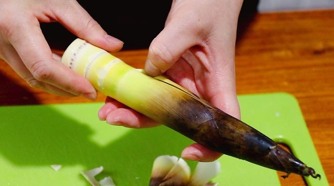 1、 春笋剥掉外衣,切掉底下一点点根部,用刀拍扁后切成细条。