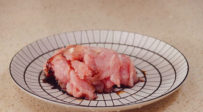 1、 猪肉先用水冲洗一下,切成薄片后加入少许盐、白胡椒粉、白糖、生抽、料酒,倒入少许淀粉和食用小苏打,再加一点点食用油,用手抓匀腌制一下。
