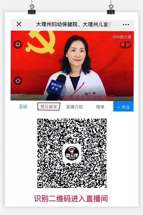 11月13日上午11:00-12:00,第646期《政风行风热线》上线嘉宾:大理州儿童医院党总支副书记、院长杜梅,将和同事将做客《政风行风热线》,就医院作风建设、执行药品价格政策、改善就医环境、提升医疗服务质量等相关问题,与听众朋友们进行沟通交流,听取大家的意见和建议。扫描图片上的二维码进入直播间 ,点击直播间菜单“意见留言”留下你所要反映的问题,工作人员会将问题汇总给相关部门并及时向您回复。