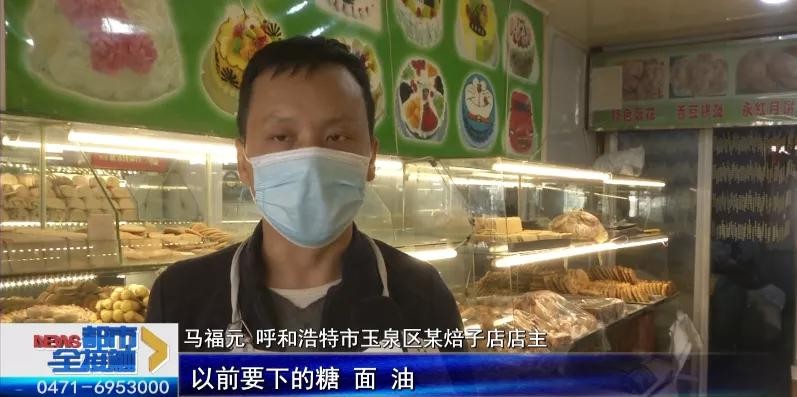 呼和浩特市回民区某焙子店店主马福元:以前要下的糖面油,主要是鸡蛋,这些我都存下了点。这一批用完了,我就是调价,调价就是焙子1个(上调)0.5元,称斤的就一斤(上调)1块钱。