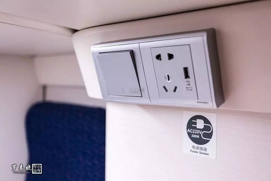 “一铺一世界”中,有三孔、两孔(电压220V)插座,USB插口,便于使用电子设备娱乐、办公。卧铺上方不仅有明亮的顶灯,还有阅读灯、书报网、书报袋;在床头有可调角度的靠背。卧铺边除隐藏式衣帽钩,还设有小桌,既可以放水杯、手机等小物品,也可以当书桌、饭桌使用。