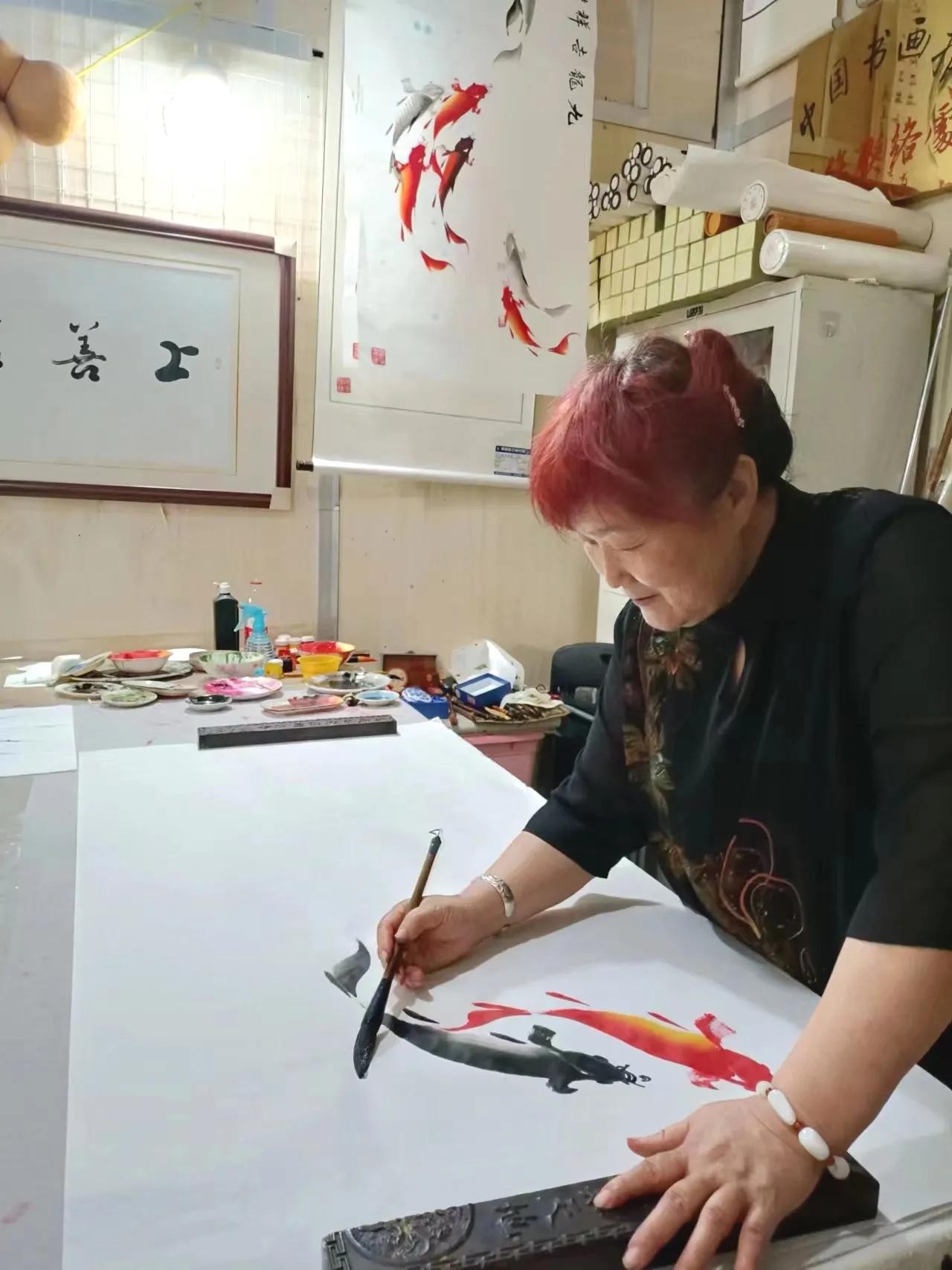 于玮绘鱼十分讲究,用笔造型惟妙惟肖;鱼鳍燥笔一挥而就,点睛栩栩出神;狼毫线描鱼骨,丰满雅致,赋予生命的张力活灵活现。特别值得点赞的是,于玮大胆地运用朱砂、首红、胭脂等颜料,比例巧妙,精心调制,给她的鱼画注入了通体红亮、引人喜悦的魅力。所用朱砂颜料,又称辰砂、丹砂、赤丹、汞砂,具有金刚金属光泽。因其采自于日月精华的矿脉中,吸收了天地之正气,带有极强的磁场,颇具辟邪、安神、定惊、明目、杀菌之功效,因而广受人们喜爱。这也是于玮所绘鱼画作品流行齐鲁大地的原因。