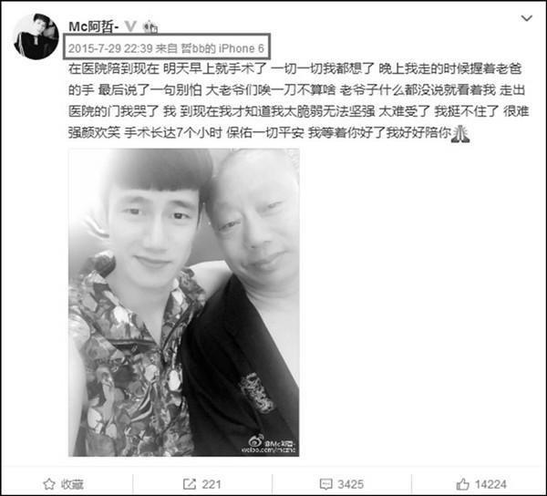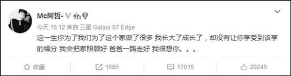 在昨天下午阿哲的微博发了一条消息!一个让所有人都悲痛的消息,阿哲的父亲去世了!阿哲微博这样写到“这一生你为了我们为了这个家做了很多 我长大了成长了,却没有让你享受到该享的福分 我会把家照顾好 爸爸一路走好 我很想你。。。”消息一出所有主播粉丝一片震惊!纷纷用微博的方式对阿哲进行各种方式的安慰!希望阿哲节哀,老爷子一路走好!